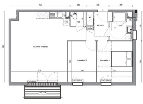 comprenant une entrée avec placard, cuisine ouverte sur séjour, 2 chambres, salle d'eau avec douche accessible PMR et WC