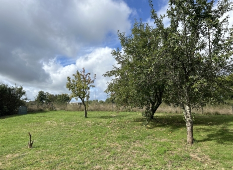 Grand jardin clos avec terrasse offrant un cadre de vie paisible avec vue sur les champs environnants.